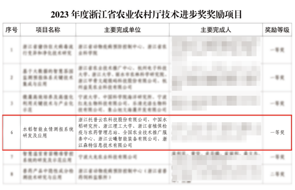 近日,加快建設(shè)創(chuàng)新浙江因地制宜發(fā)展新質(zhì)生產(chǎn)力動(dòng)員部署會(huì)暨全省科學(xué)技術(shù)獎(jiǎng)勵(lì)大會(huì)在杭州舉行。大會(huì)公布并表彰了2023年度浙江省科學(xué)技術(shù)獎(jiǎng)。其中,由浙江托普云農(nóng)科技股份有限公司(股票簡(jiǎn)稱:托普云農(nóng),股票代碼:301556)牽頭完成的《水稻智能蟲(chóng)情測(cè)報(bào)系統(tǒng)研發(fā)及應(yīng)用》成果榮獲2023年度浙江省科學(xué)技術(shù)進(jìn)步獎(jiǎng)三等獎(jiǎng)。這是該項(xiàng)成果繼榮獲“2023年度浙江省農(nóng)業(yè)農(nóng)村廳技術(shù)進(jìn)步獎(jiǎng)一等獎(jiǎng)”之后斬獲的第二個(gè)重磅獎(jiǎng)項(xiàng),充分展現(xiàn)了托普云農(nóng)在農(nóng)業(yè)科技創(chuàng)新領(lǐng)域的卓越實(shí)力。